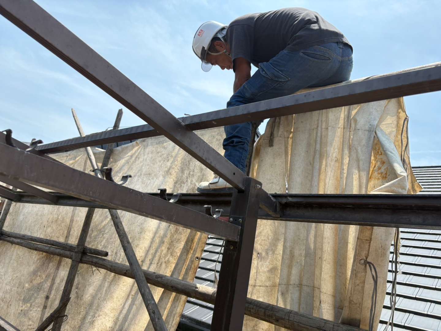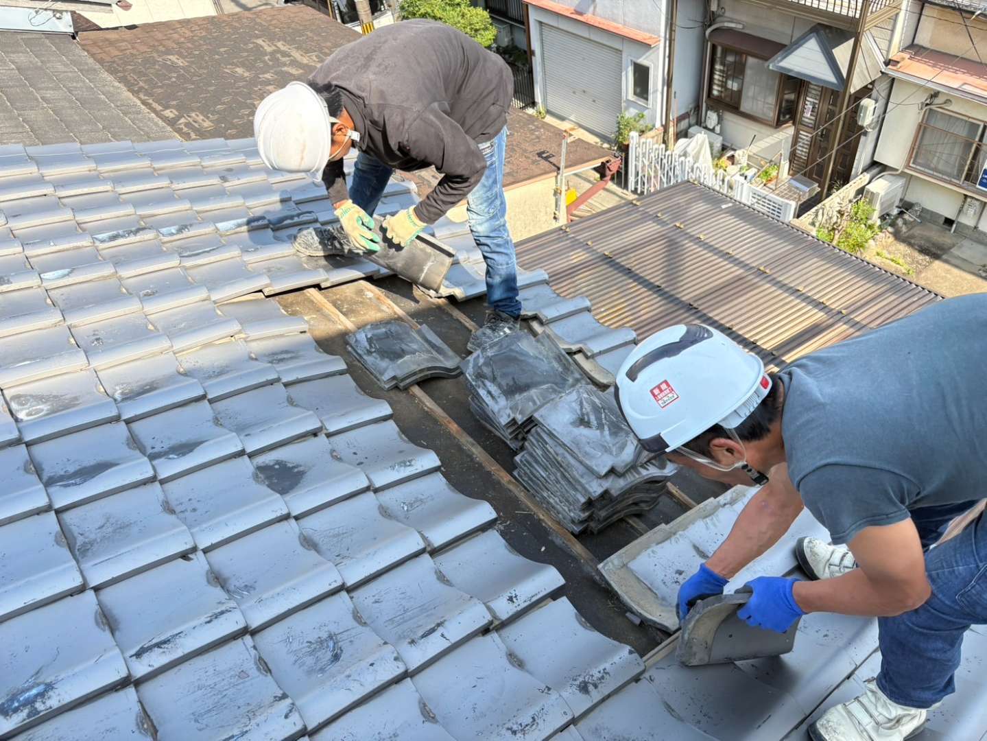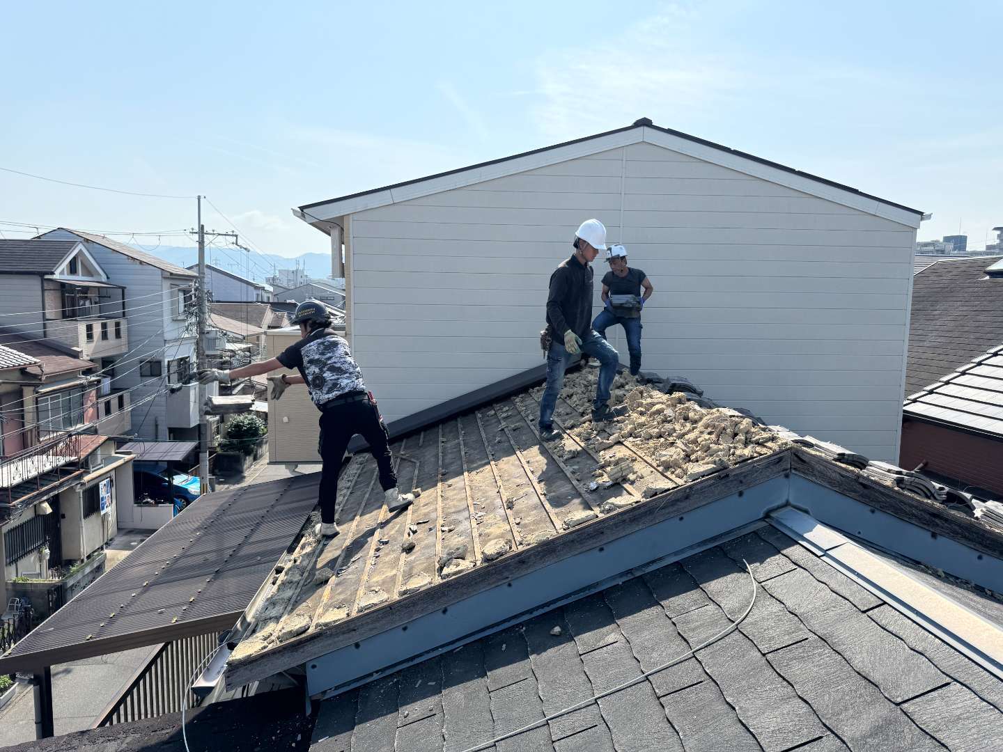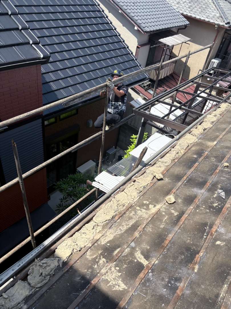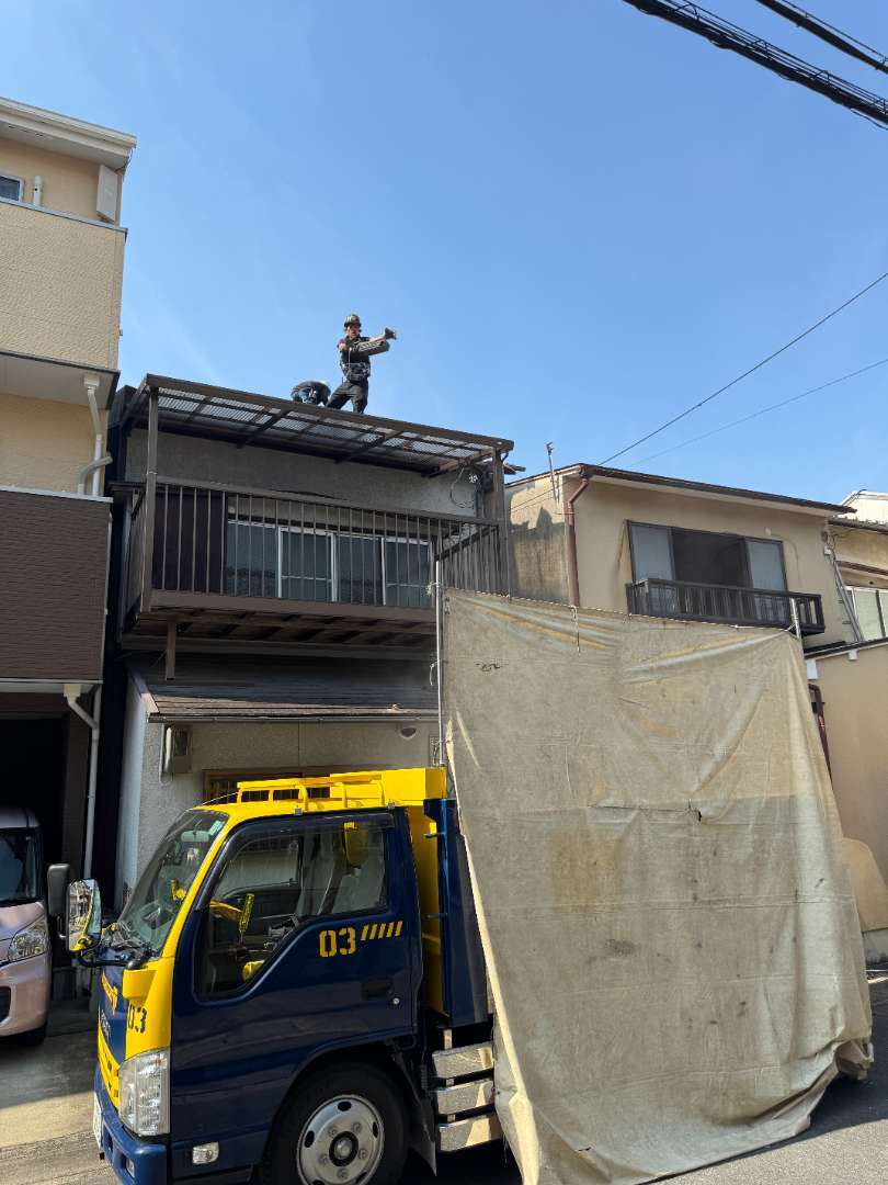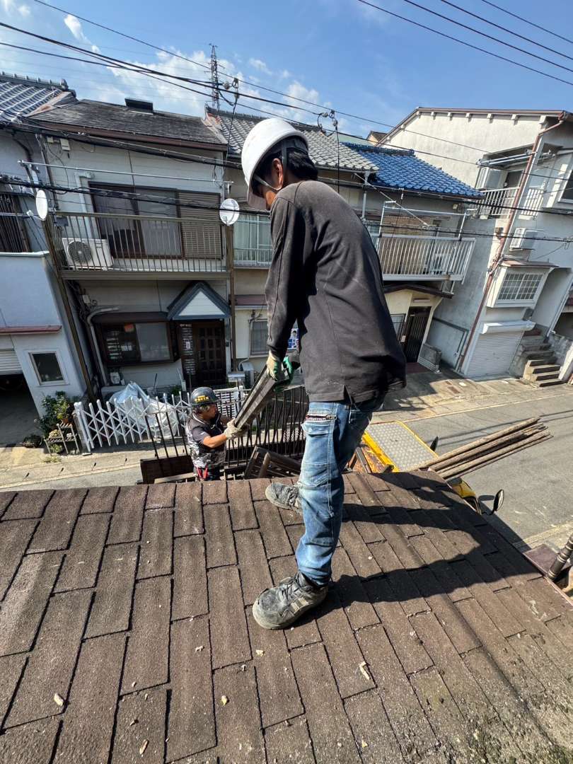 瓦・土・瓦留めの釘や銅線など細かく分別し、飛散防止のシートでダンプを囲い、歩行者等に気をつけながら投げ込んでいきます👷♂️ この時期の瓦の撤去が一番きつい💦