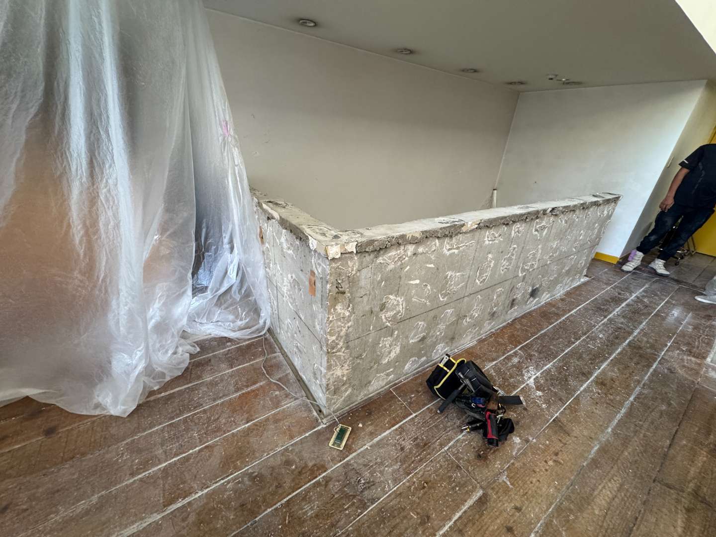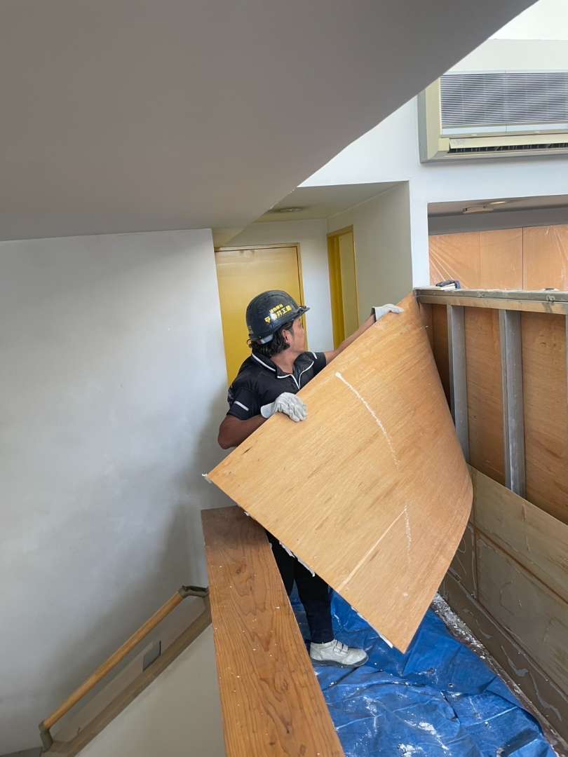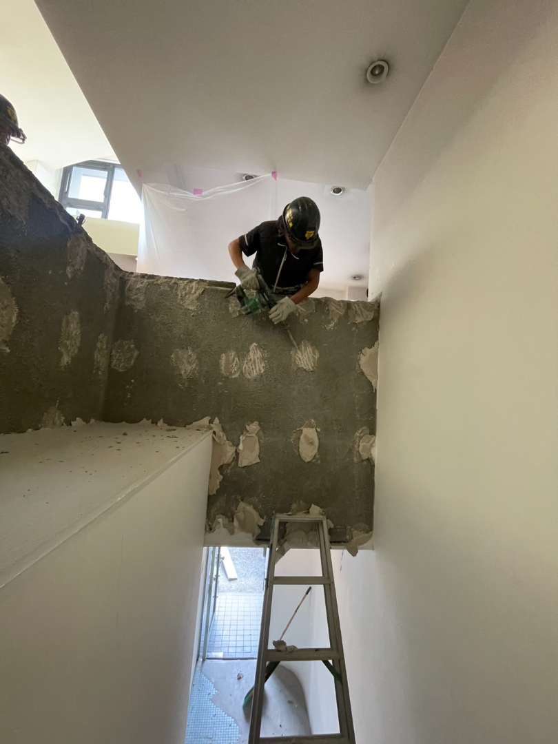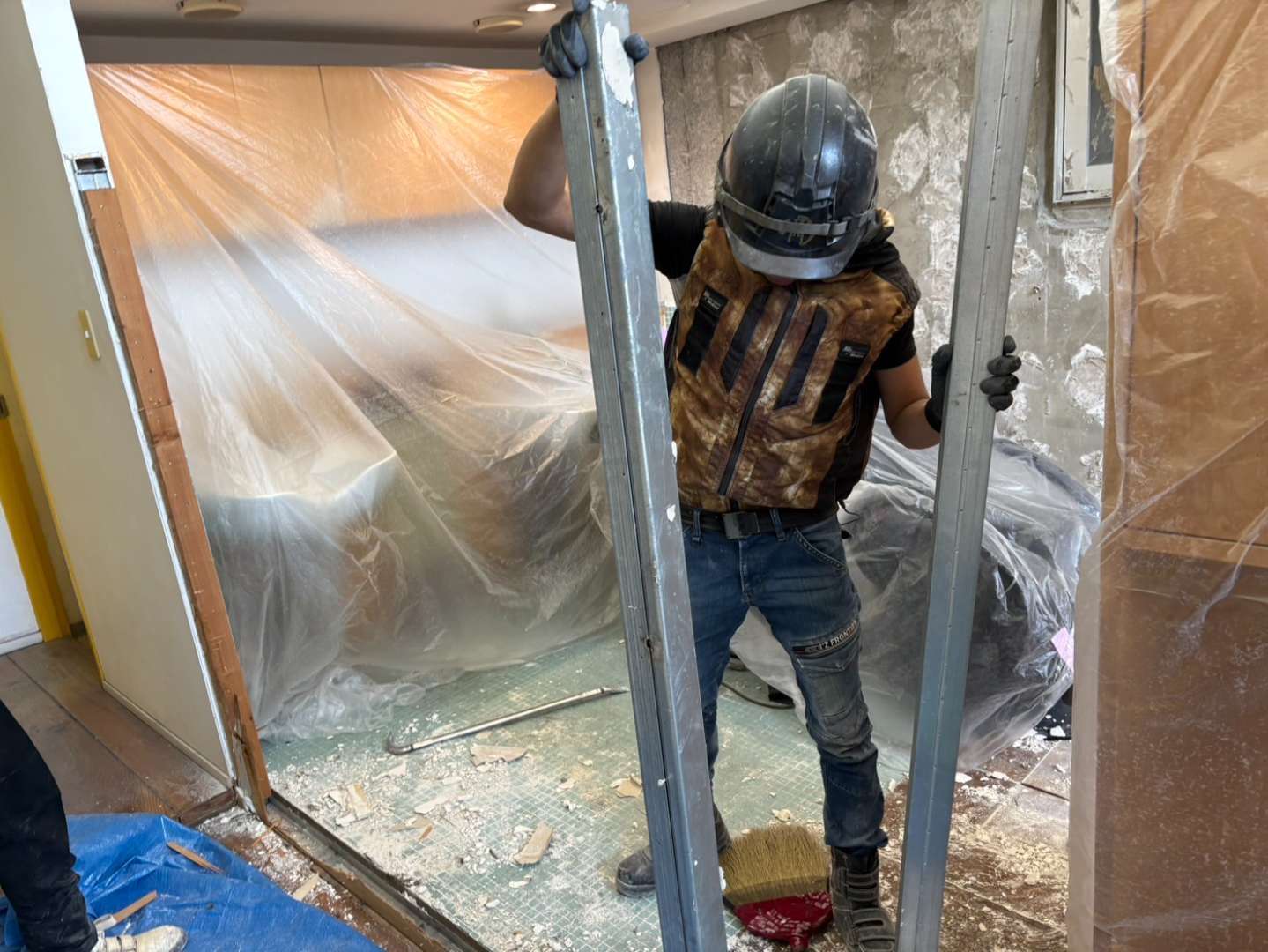 ここからの作業は、コンプレッサーを使用してのハツリ作業となるため、騒音振動の影響の出る階下の店舗様や階上の方との協議の上進める必要があり、すぐには再開できない状況です😅