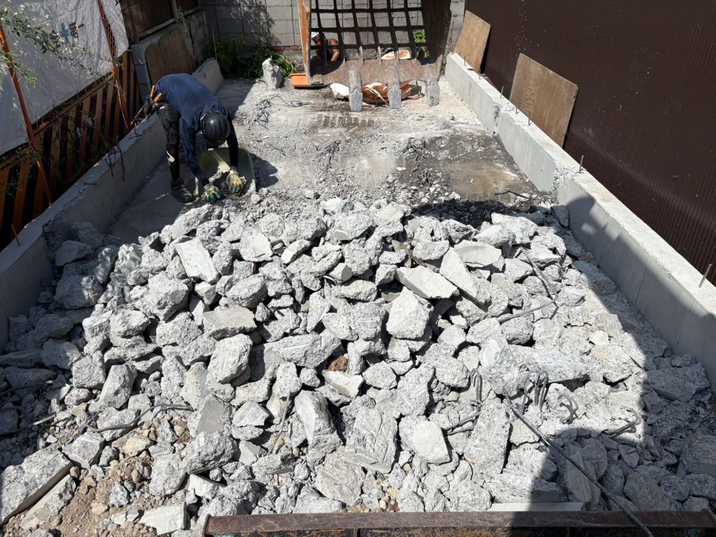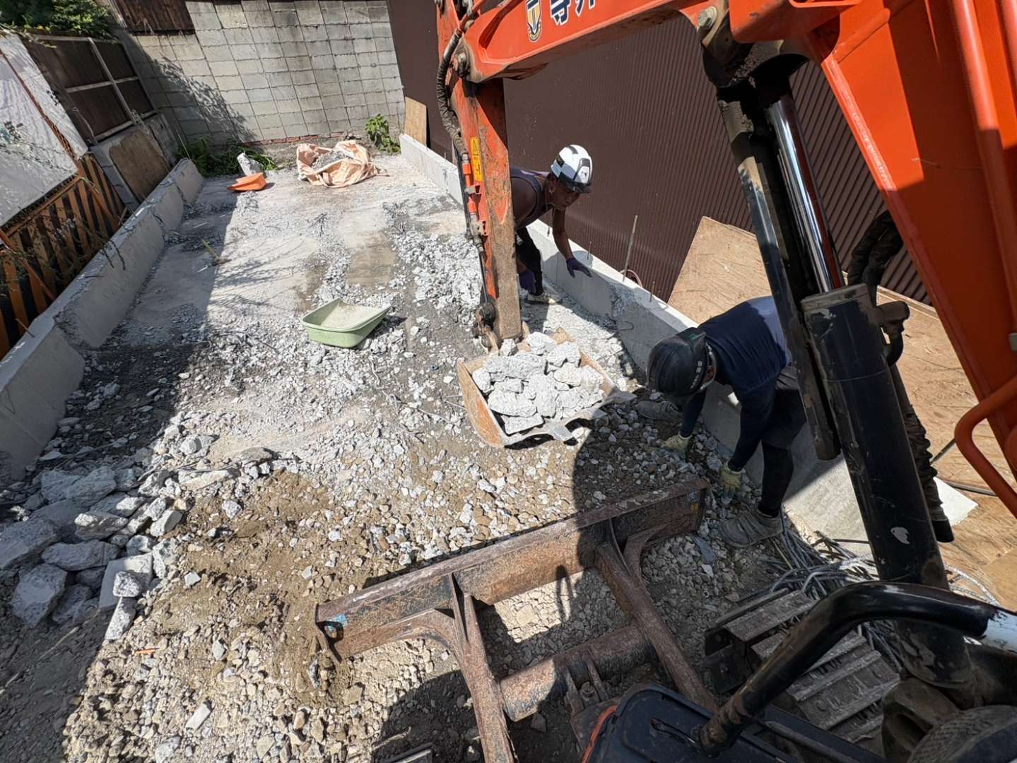 基礎解体は、アイヨンにて施工!!敷地も狭く重機1台での施工となありますので、ある程度突けたらバケットに交換してCOガラを積み込み、現場内整理整頓しながら地道に進めます🫡
