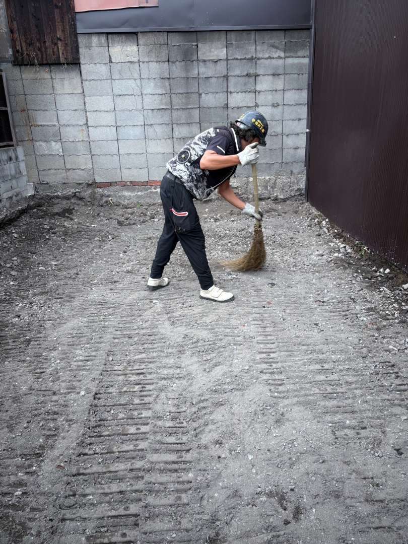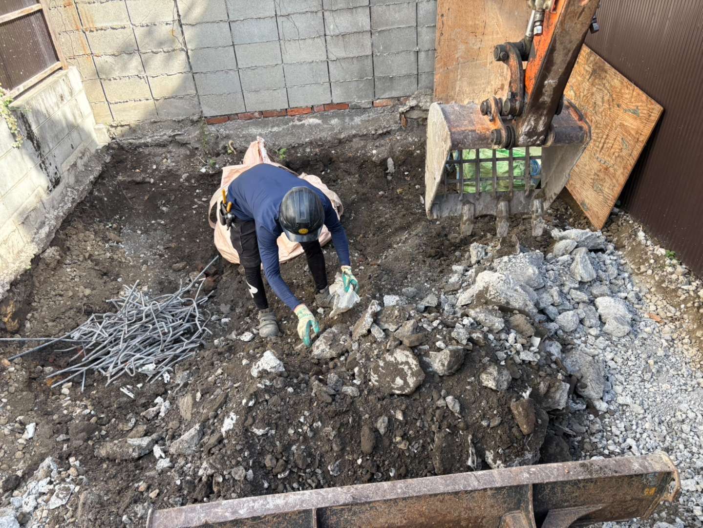 スケルトンバケツから抜け落ちた細かいコンクリート片も丁寧に手作業にて拾い集めます👍