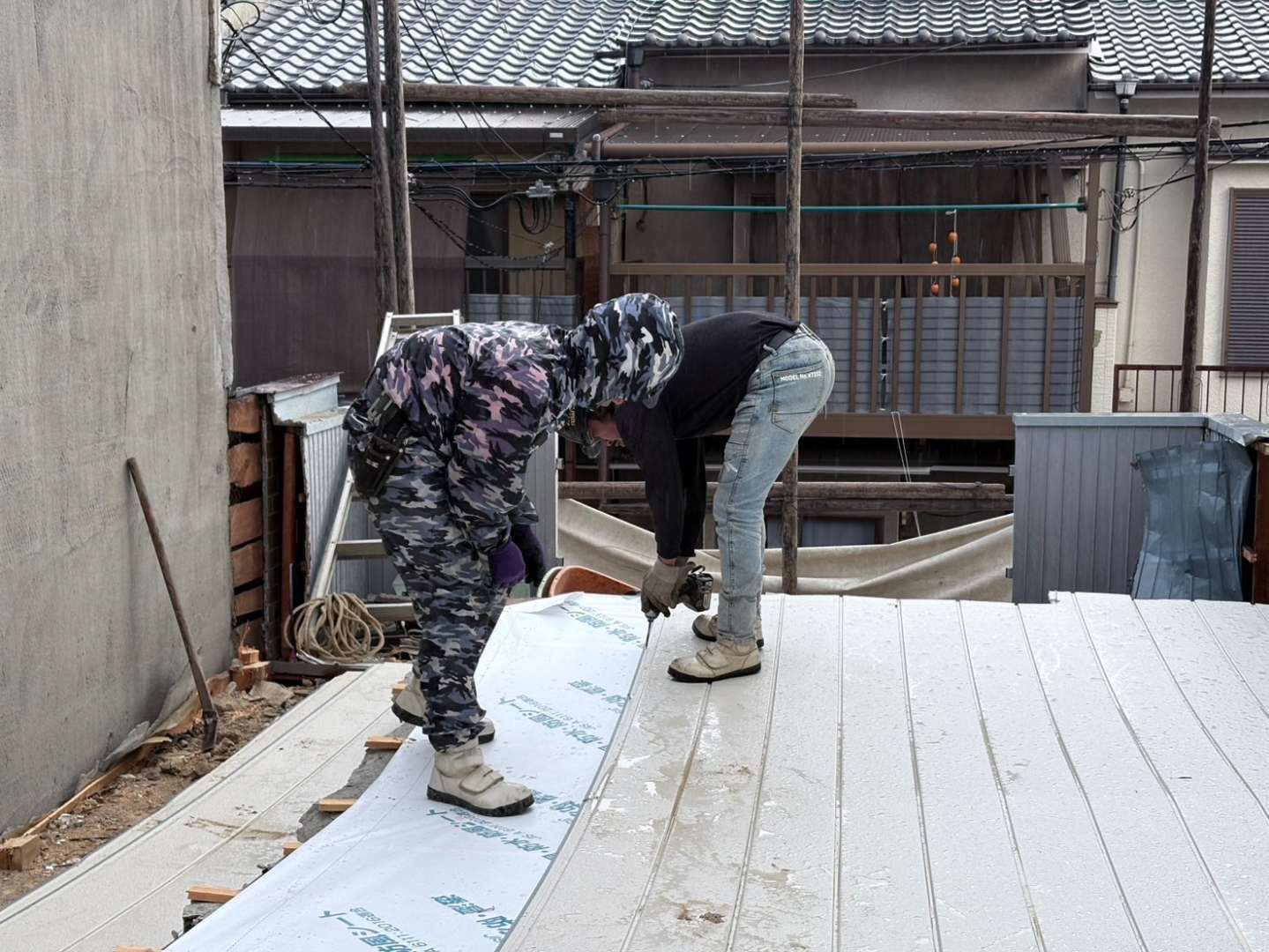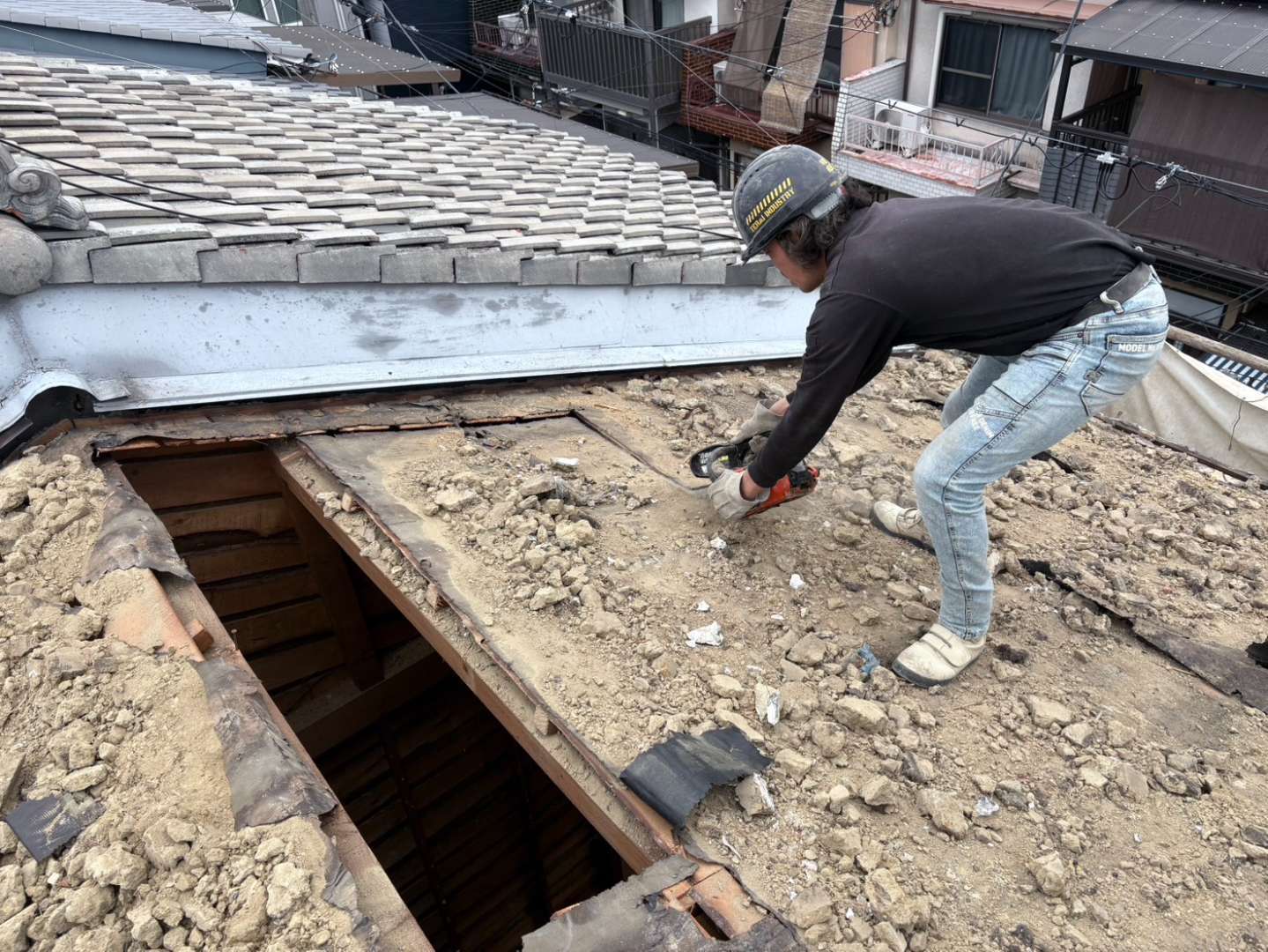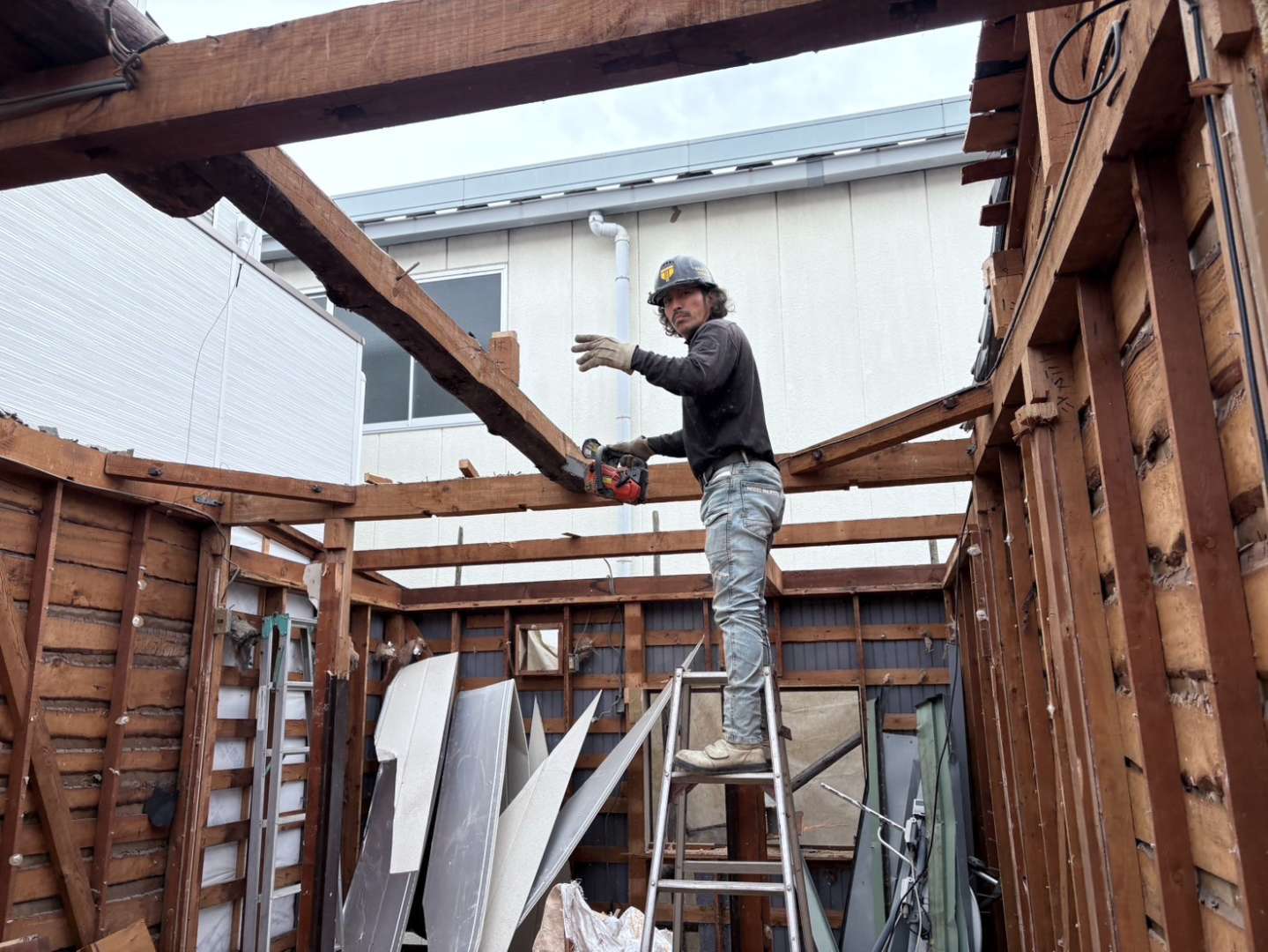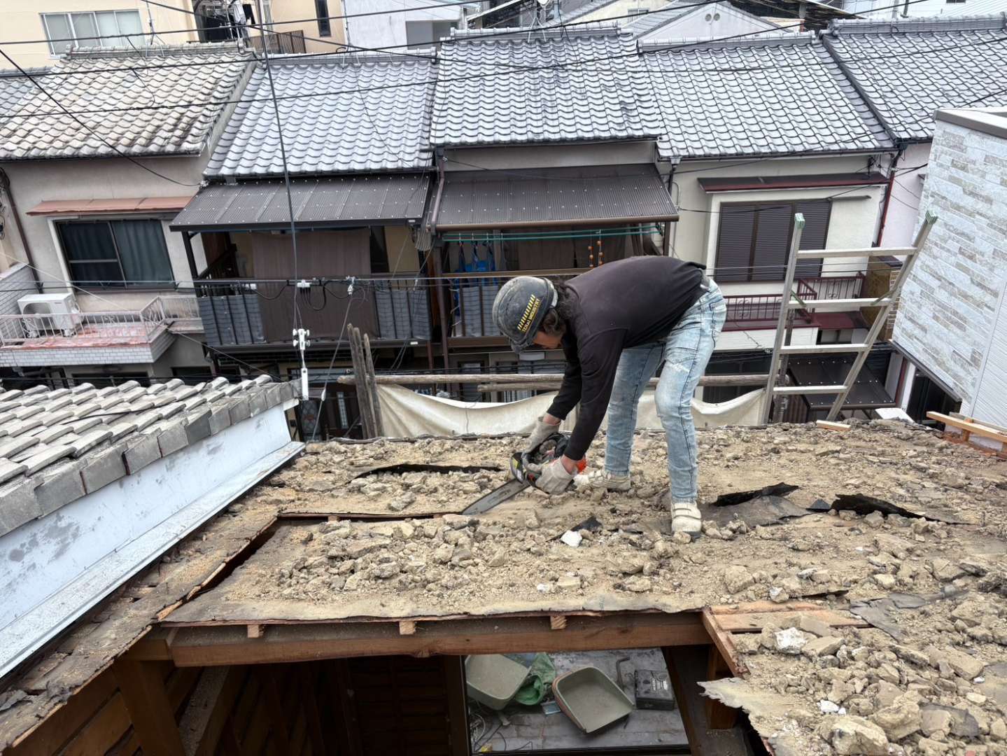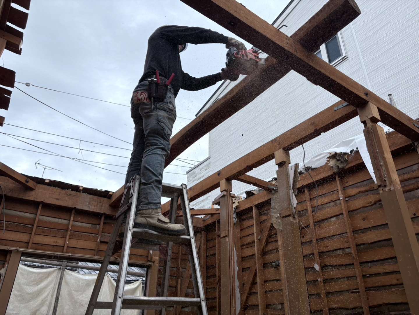 切り落とした後は、木とルーフィングを分別し、木屑は積み込み💪