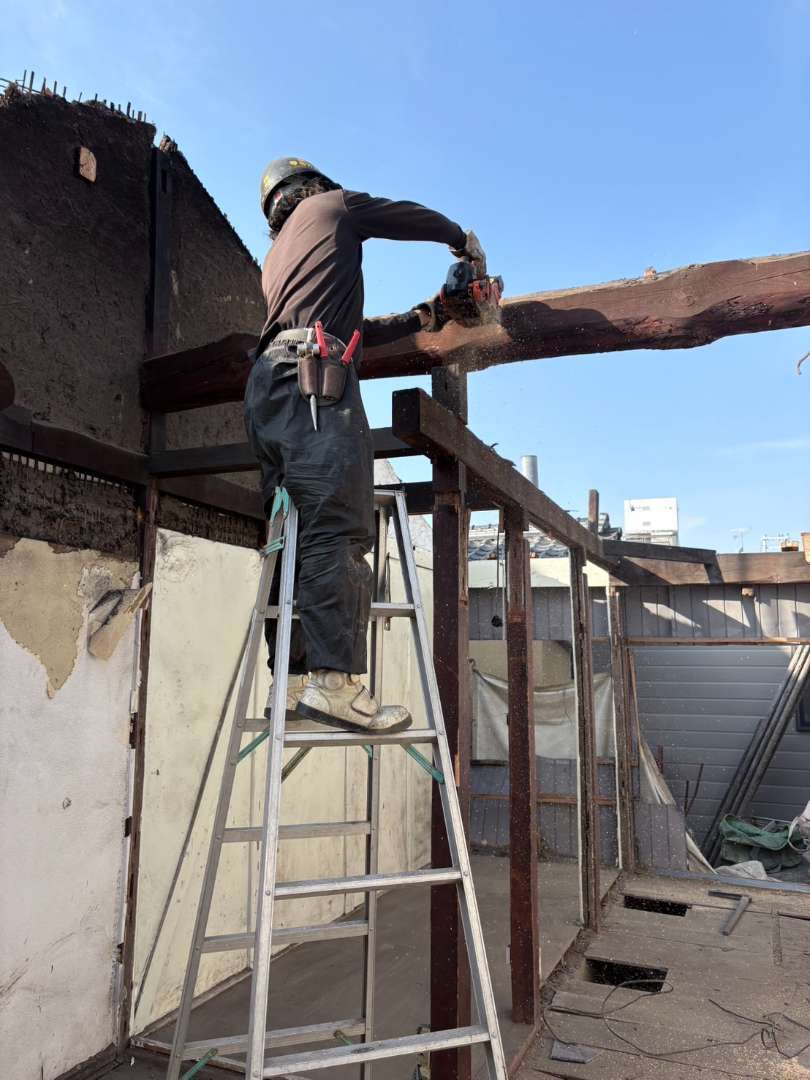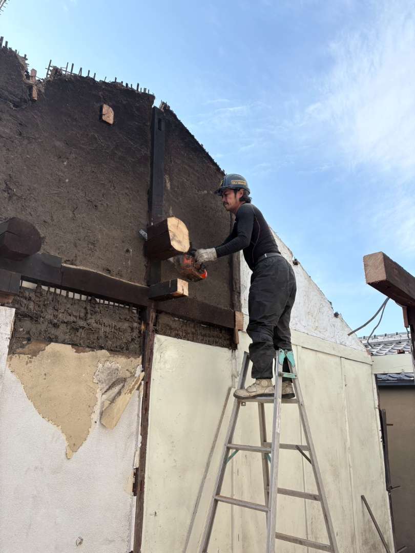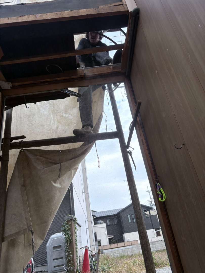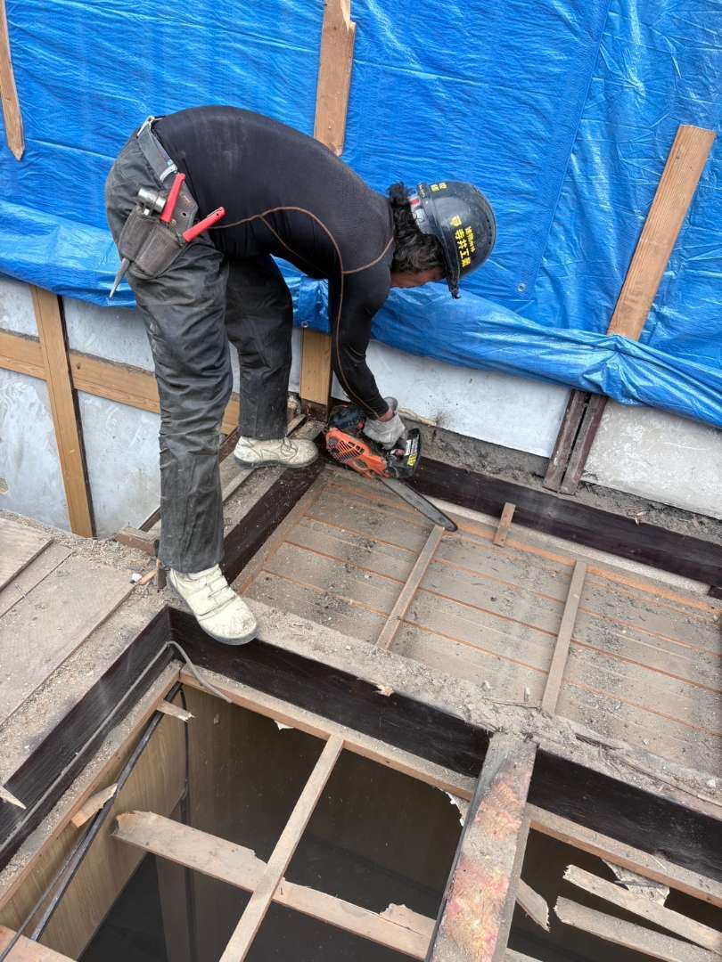 梁の縁切り及び柱への切り込みなど下準備を整え、ロープにて引き倒し💪