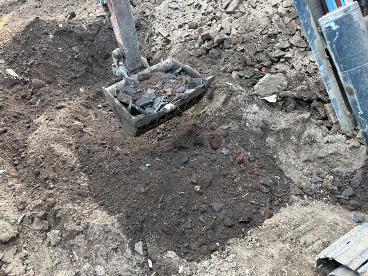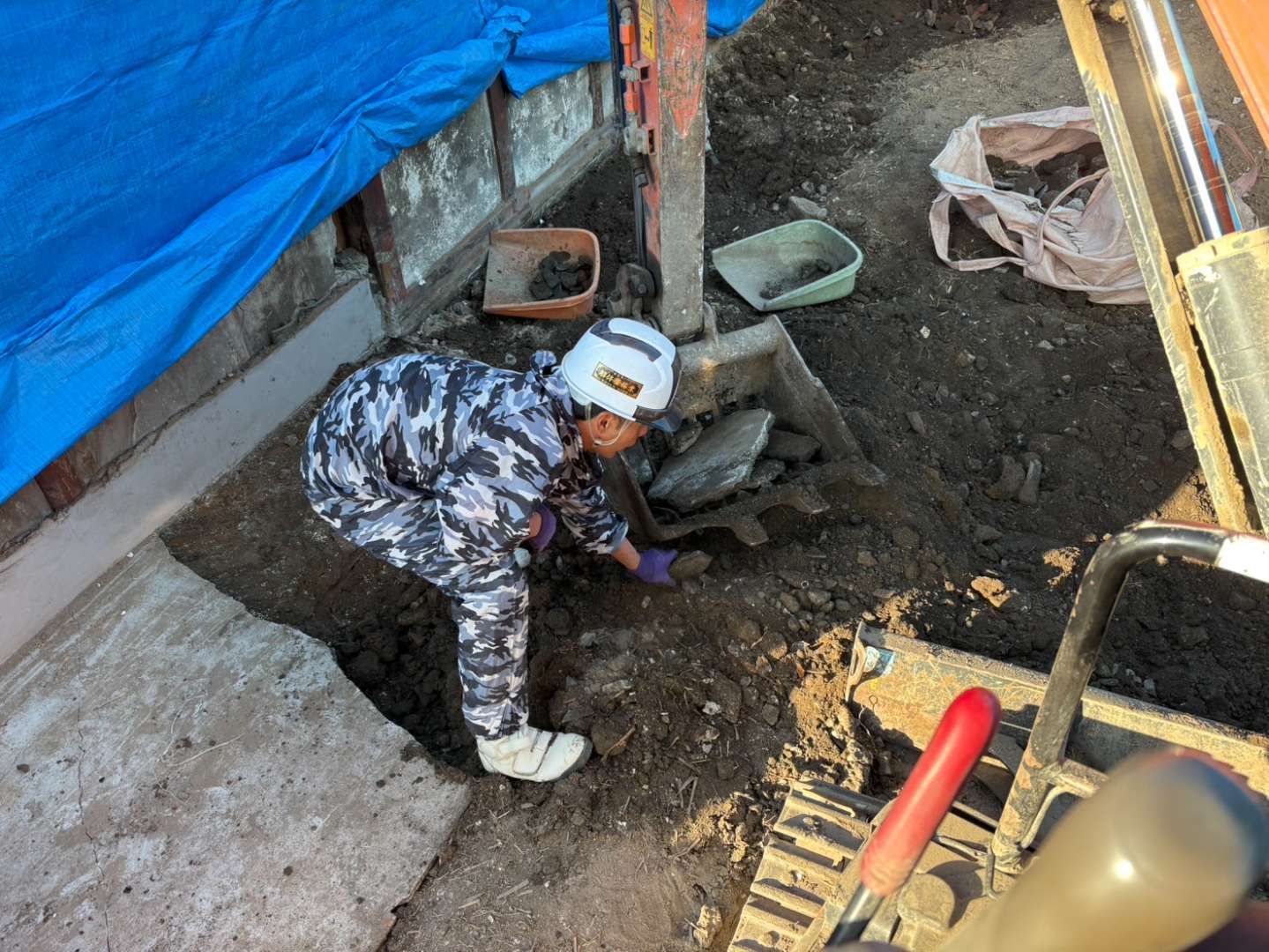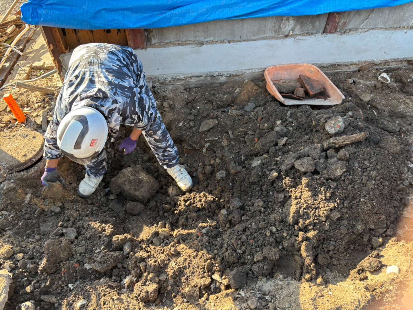 スケルトンバケツから抜け落ちた細かいコンクリート片は、地中に埋もれないよう人力にて綺麗に拾い集めます
