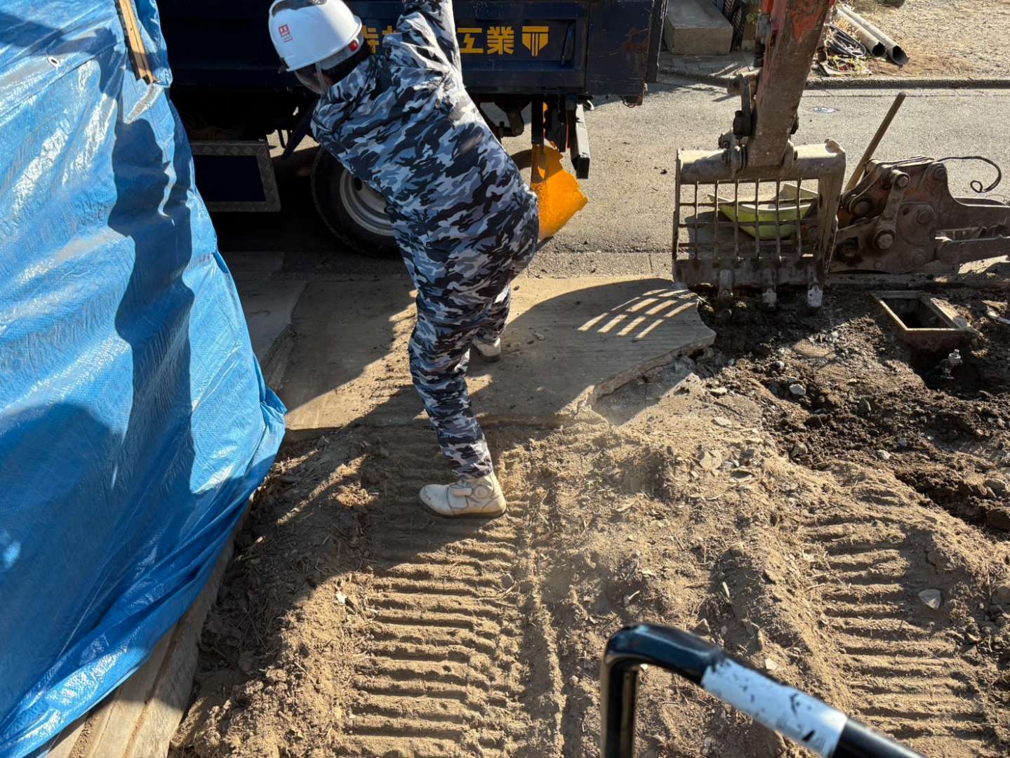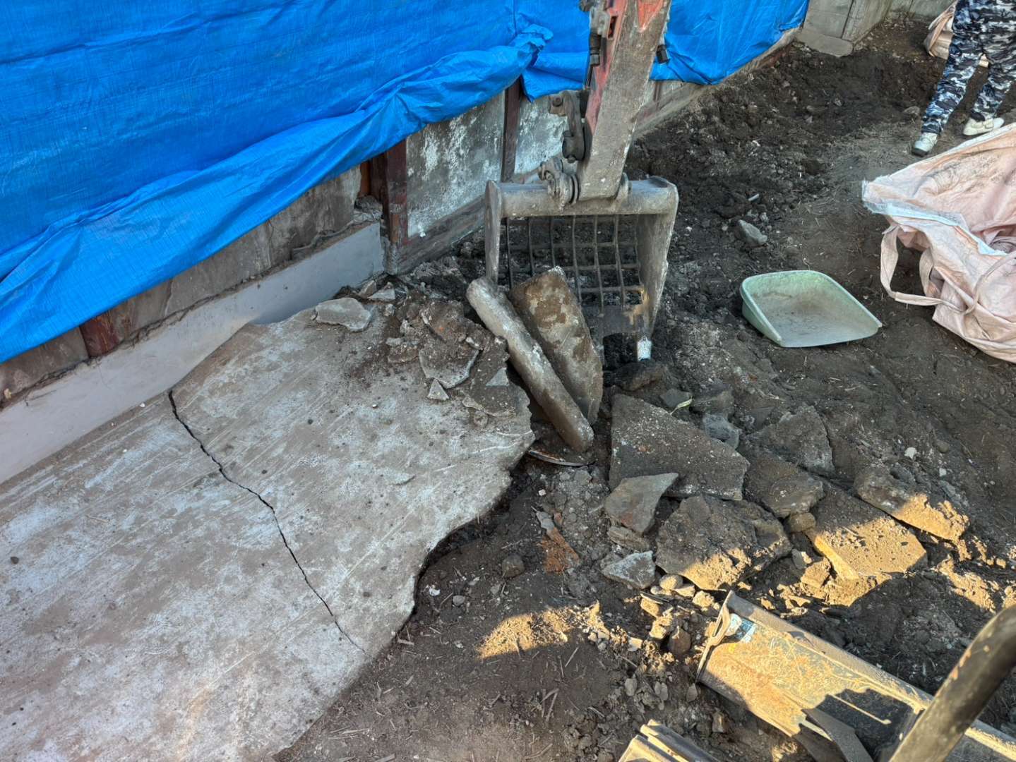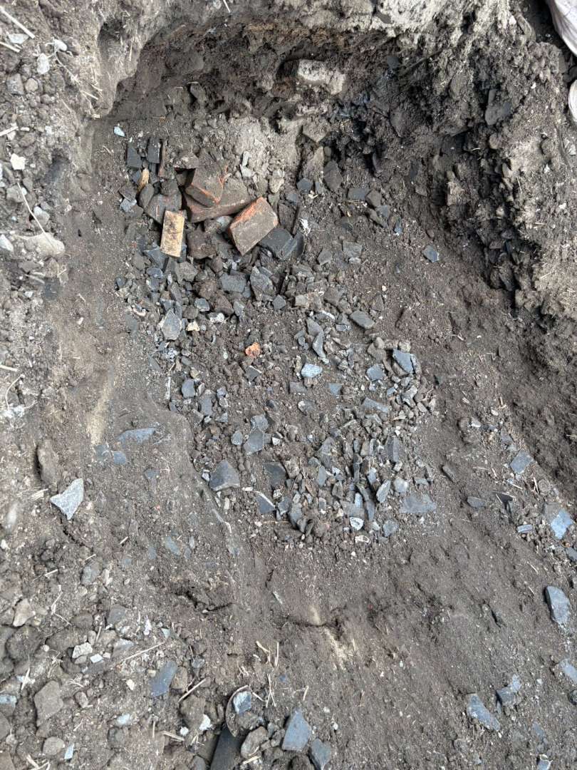 スケルトンバケツから抜け落ちた細かいコンクリート片は、地中に埋もれないよう人力にて綺麗に拾い集めます
