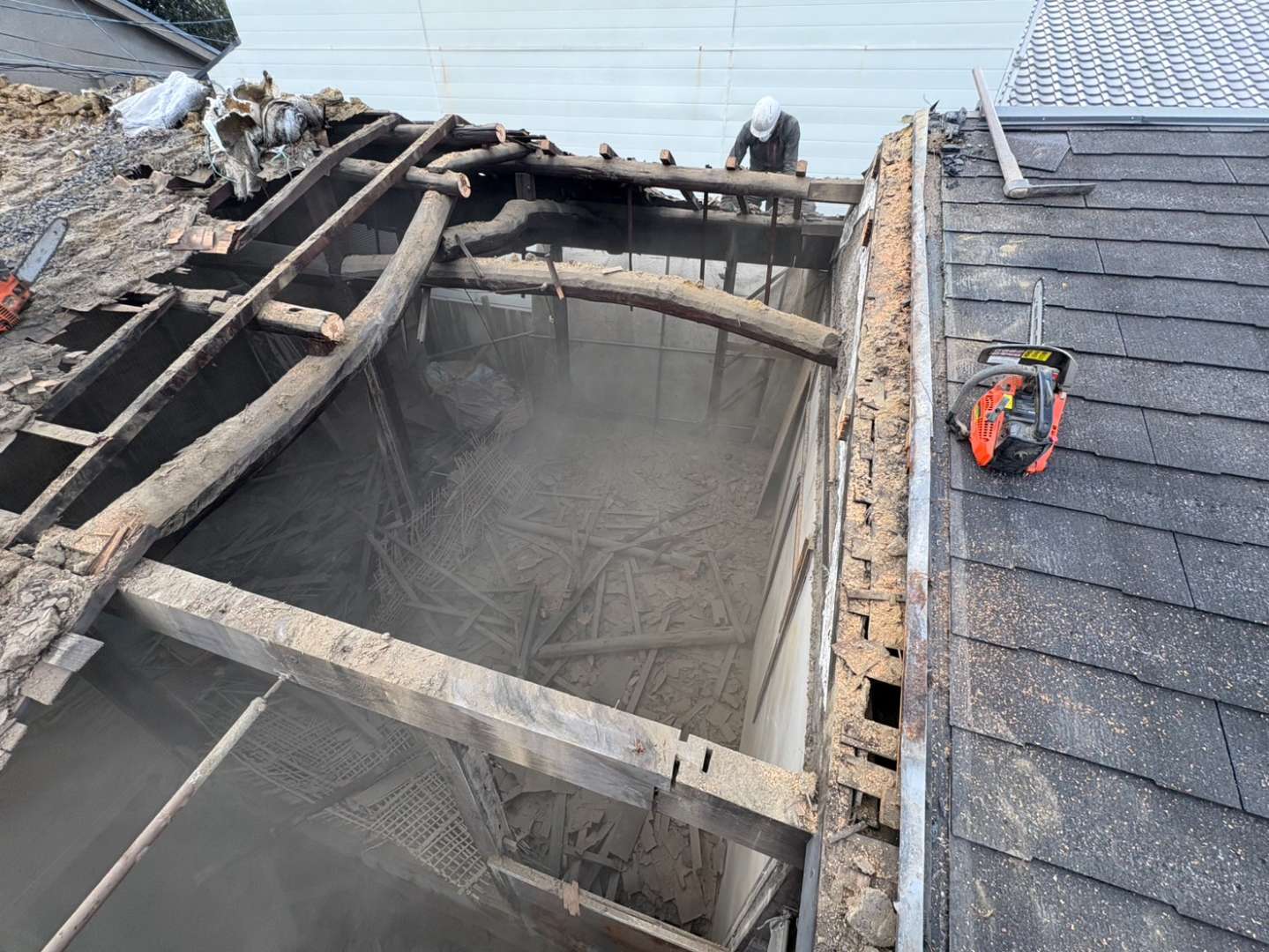 腐食などが進行しており、危険な建物ですが、段取り良く順調に進んでおります🎶 明日で2F部分を完了させ、重機解体に向けての段取りをしっかり行いたいと思います👷