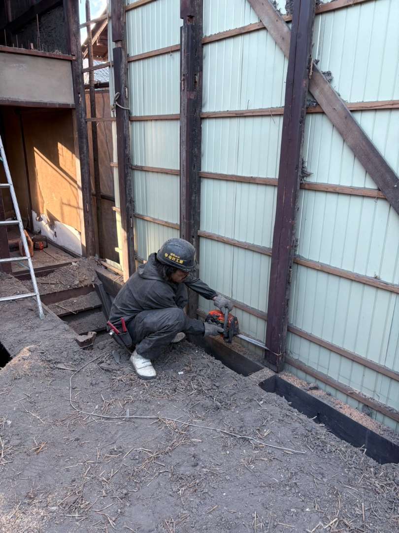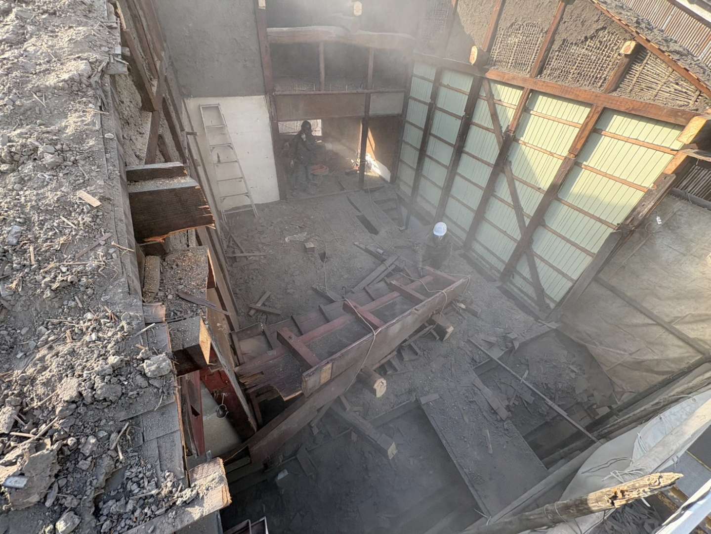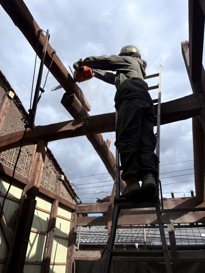 柱に切り込み、梁の縁切りなどの仕込みをきっちり行い、ロープにて引き倒し💪