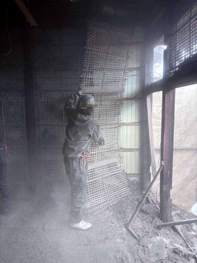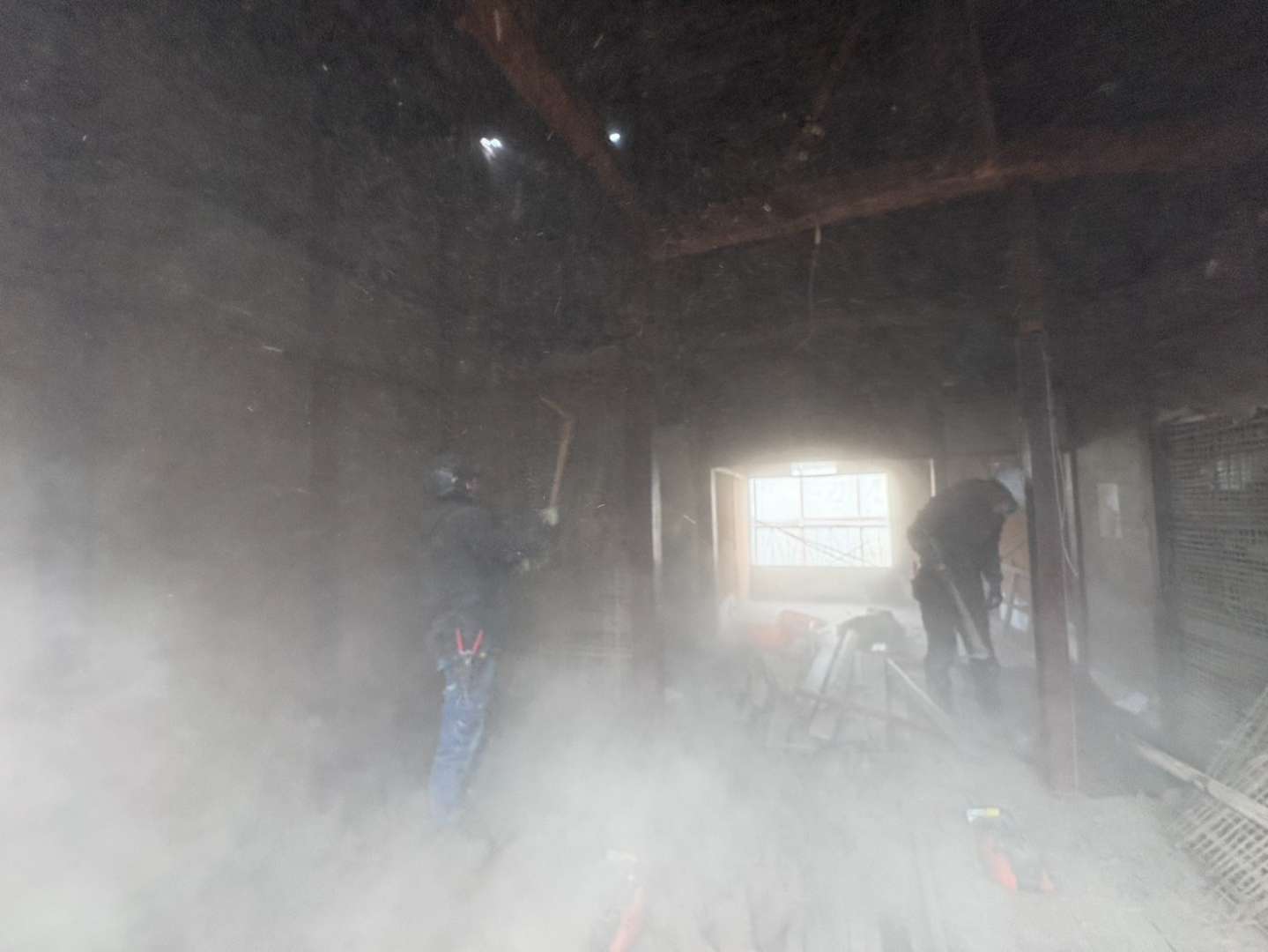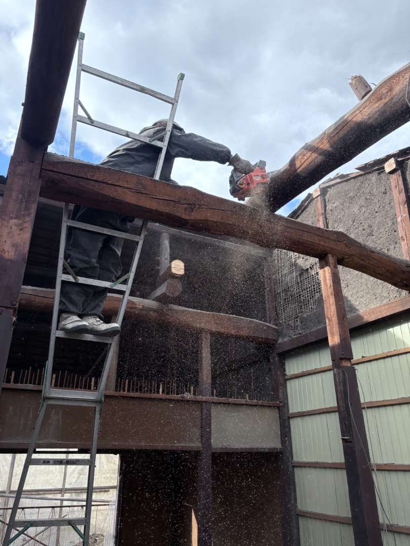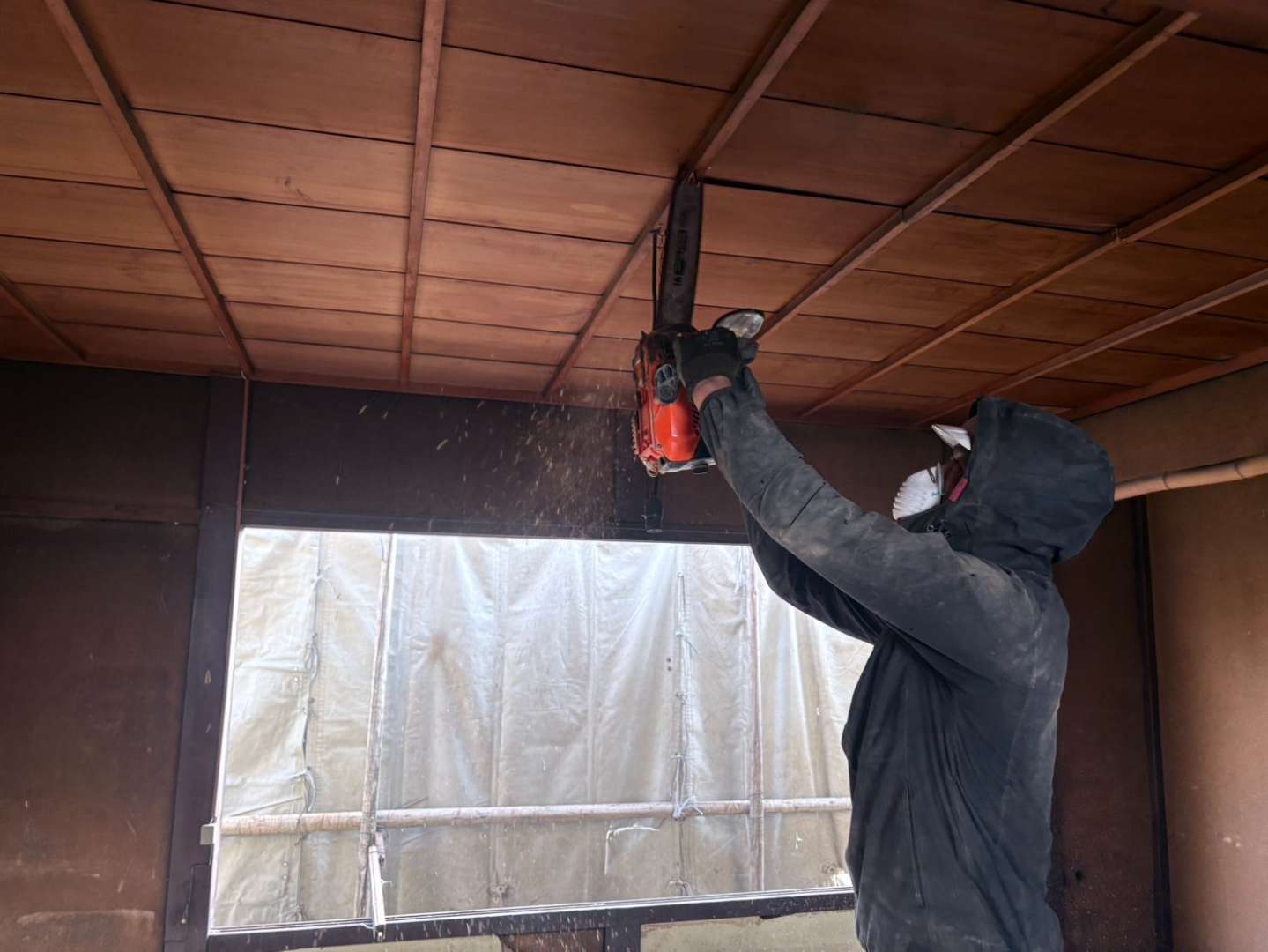 柱に切り込み、梁の縁切りなどの仕込みをきっちり行い、ロープにて引き倒し💪