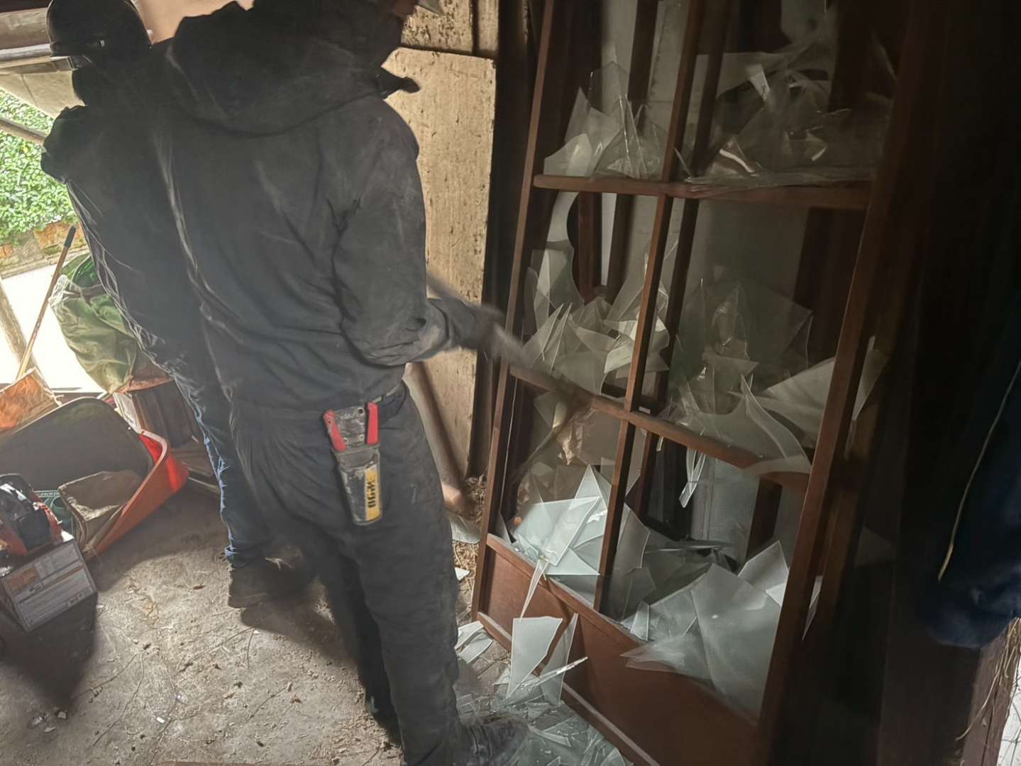 解体中にガラスの飛散し、怪我や地中に埋もれることを防ぐために、先に取り除きます✌️