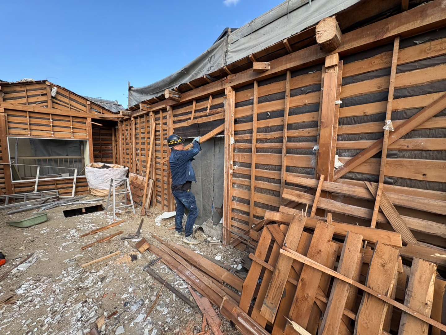 解体作業が進むにつれ、集積廃材も増えて参りましたので、明日は解体作業と並行し、集積廃材の搬出も行い、安全な作業スペースを確保できるよう進めて参ります🫡