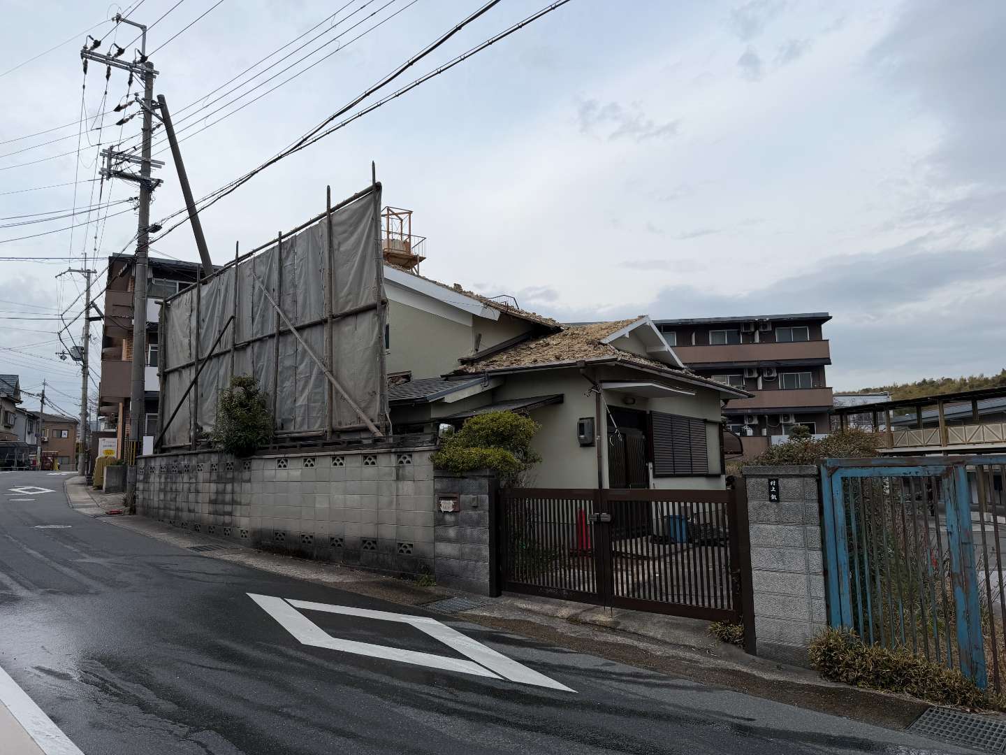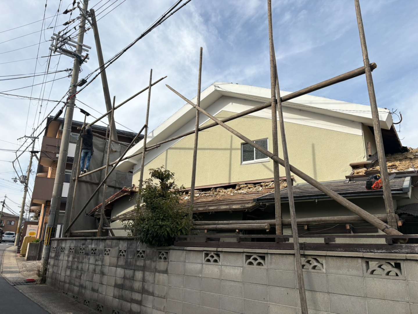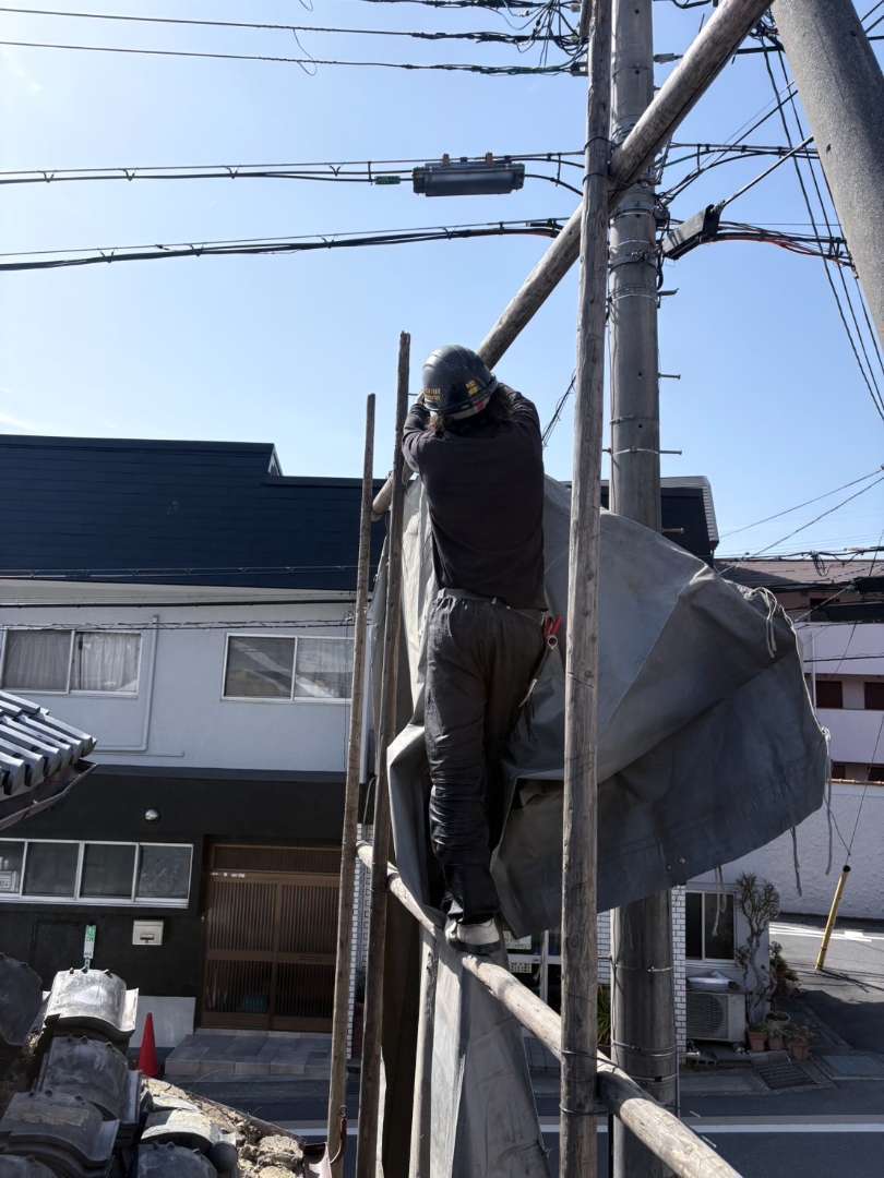ダンプが敷地奥まで入れないので、中二階部分の瓦のみ撤去し、奥の平屋部分は中二階うわやが亡くなってから第二弾で施工予定💦