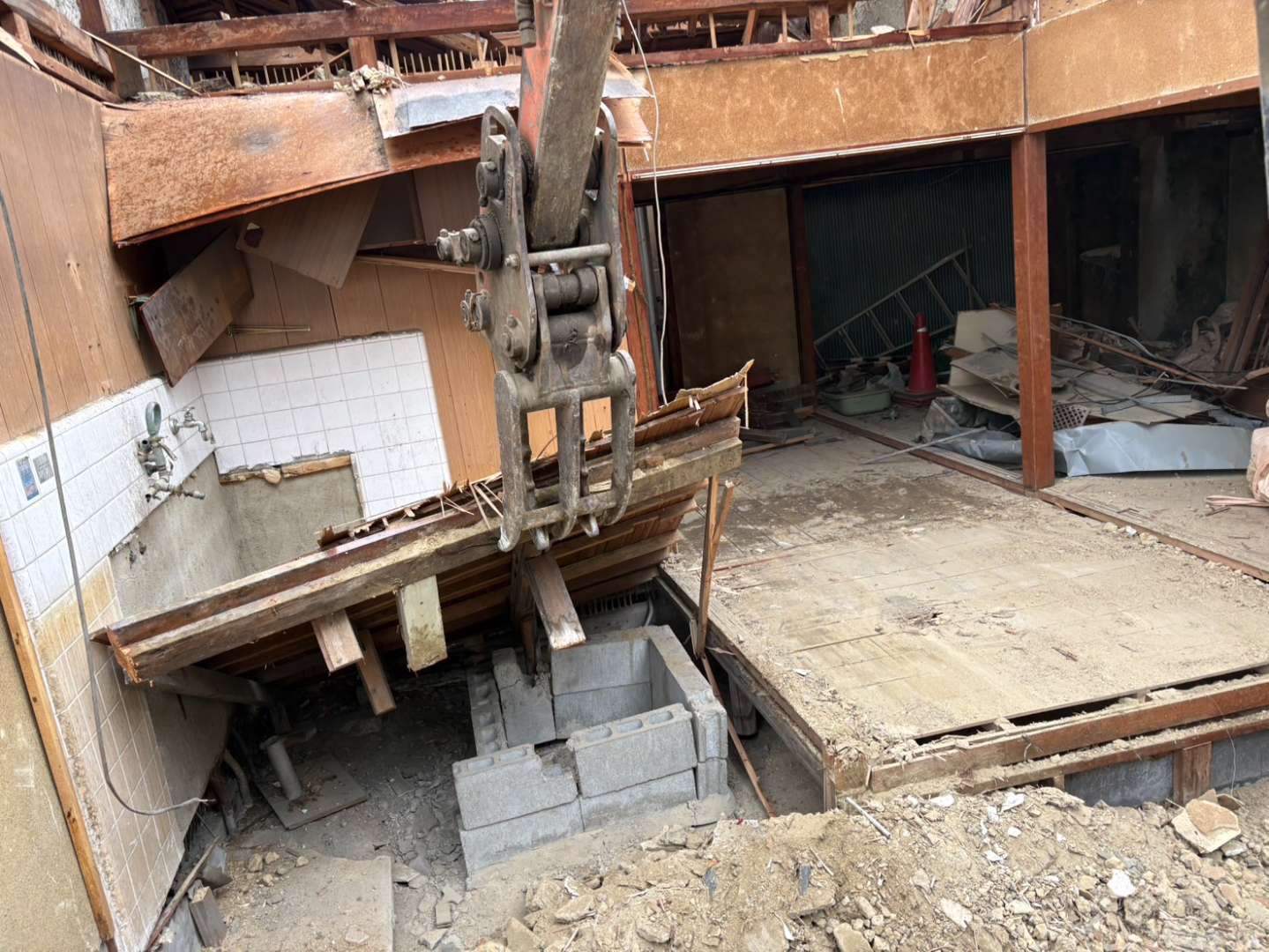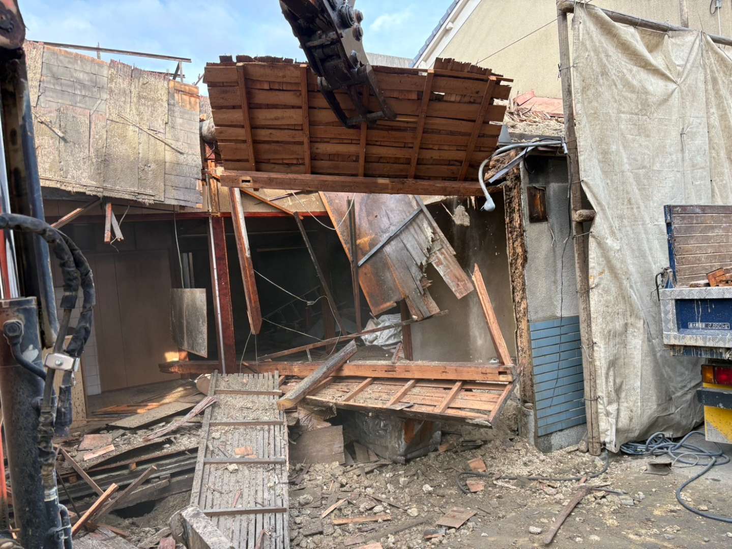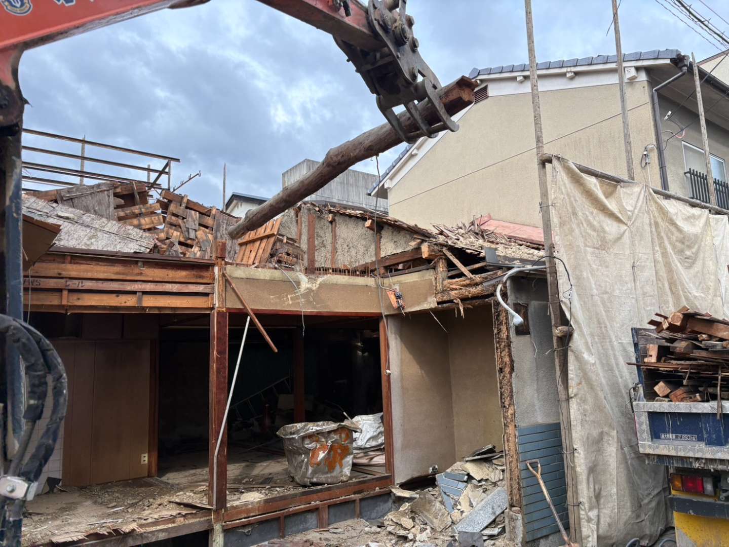 本日約半分くらい解体完了しましたが、集積廃材が貯まり出しております💦明日より壁倒しメインの作業となりますので、その前に集積廃材の搬出も行い、場内の作業スペースを十分確保した上で、隣家との接触など無いよう十分注意しながら安全第一で進めて参ります👷♂️