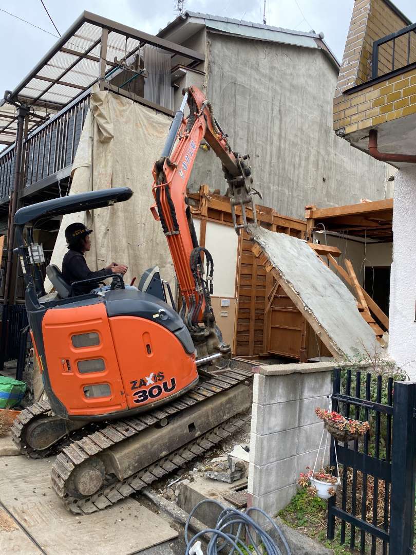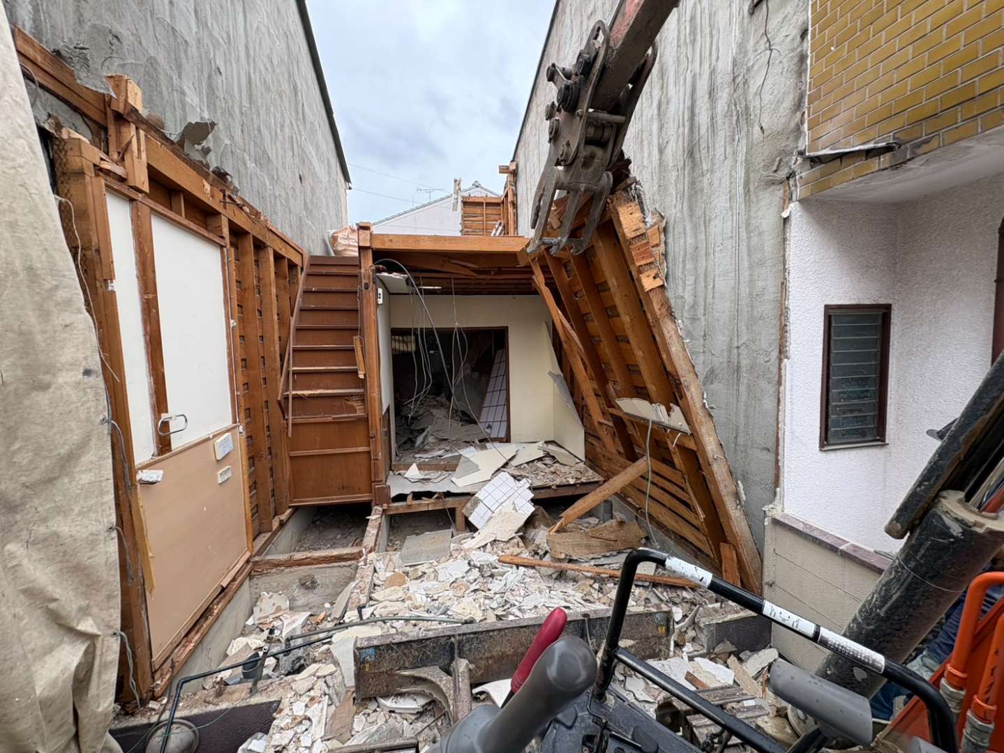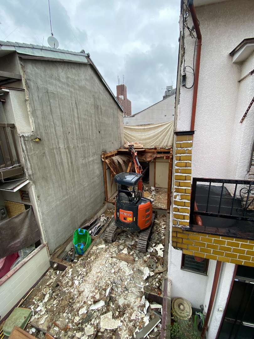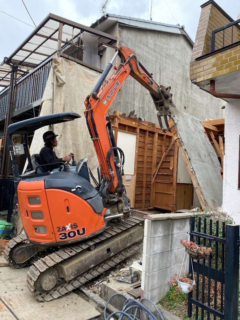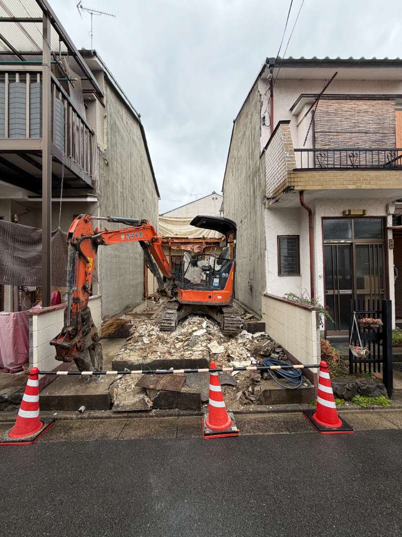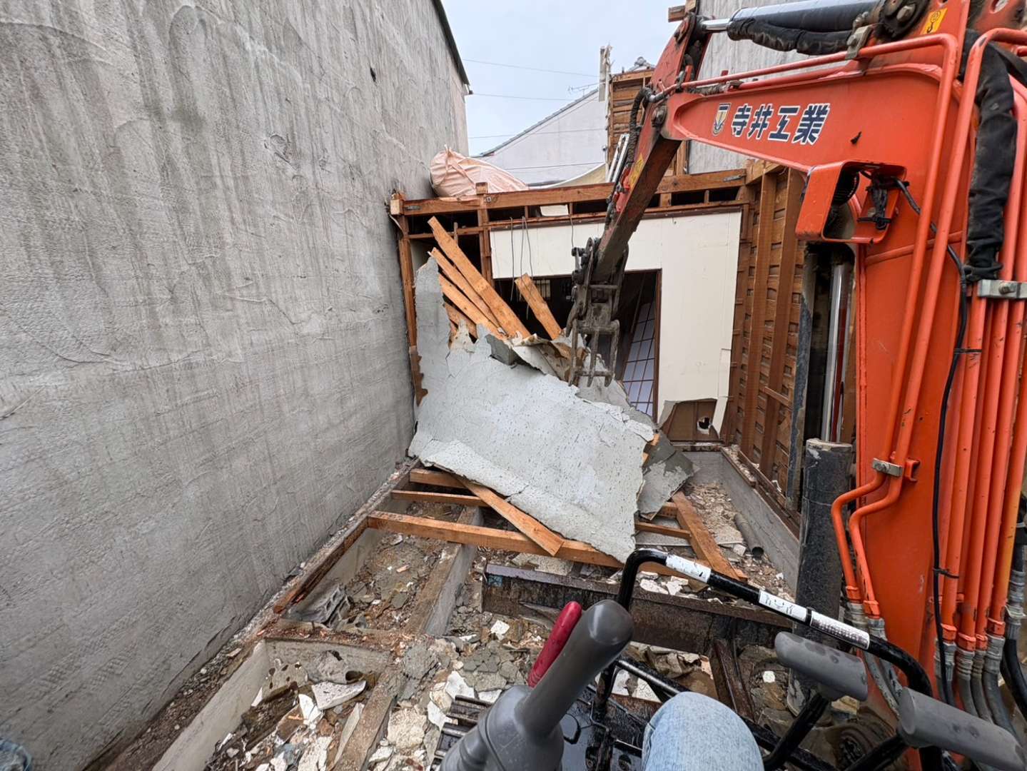 上屋解体作業完了まであと少し🤏 両側せ合わせにつき、隣家との距離も数センチですので、接触事故等無いよう、最後の最後まで安全確認しながら焦らず丁寧に作業を進めて参ります🫡