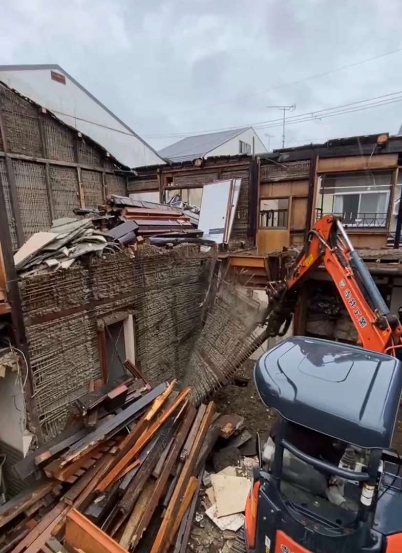 生憎の天気でしたが、スタッフの頑張りで予定工程以上に進みました🙌 明日、場内に溜まった、柱や金属屑の搬出を行い、十分な作業スペースを確保し、重機と作業員が安全に作業できる環境を作ってから、事故や怪我の無いよう残りの解体作業に取り掛かりたいと思います👷♂️